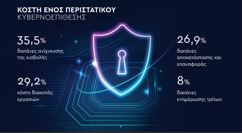 • Το κόστος επαναφοράς από ένα περιστατικό κυβερνοεπίθεσης είναι μεγάλο και μόνο το 30% αφορά την απώλεια της επιχειρηματικότητας. Το υπόλοιπο 70% είναι το κόστος ενεργειών για την ανίχνευση της επίθεσης και επαναφοράς στην επιχειρηματικότητα.