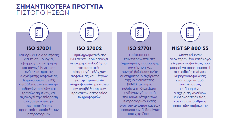 Η προσαρμογή σε πλαίσια, όπως το ISO 27001, ISO 27002, ISO 27701 ή το NIST, προσφέρει βελτιωμένα επίπεδα κυβερνοασφάλειας, κανονιστική συμμόρφωση, βελτιωμένα επίπεδα προστασίας δεδομένων, αλλά και επιχειρησιακή ανθεκτικότητα.